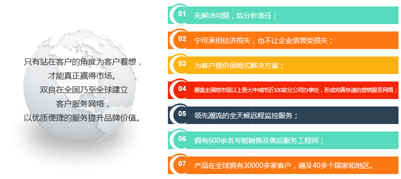 100多家分公司及辦事處遍布國內外,700 余名專職銷售及售后服務工程師,全天24 小時為客戶提供保姆式一體化服務支持。從最初的“先解決問題、后分清責任”、“設備所有權屬于用戶、質量權屬于雙良”、“寧可經濟受損失,也不讓企業信譽受損失”等服務承諾,到“追求零故障、追求零投訴”、“一站式、系統級服務”、“專家+管家式服務”等服務理念,雙良一直將服務文化深植于企業文化、組織流程和員工思維模式之中,根據客戶需求提供個性化、定制化的服務。